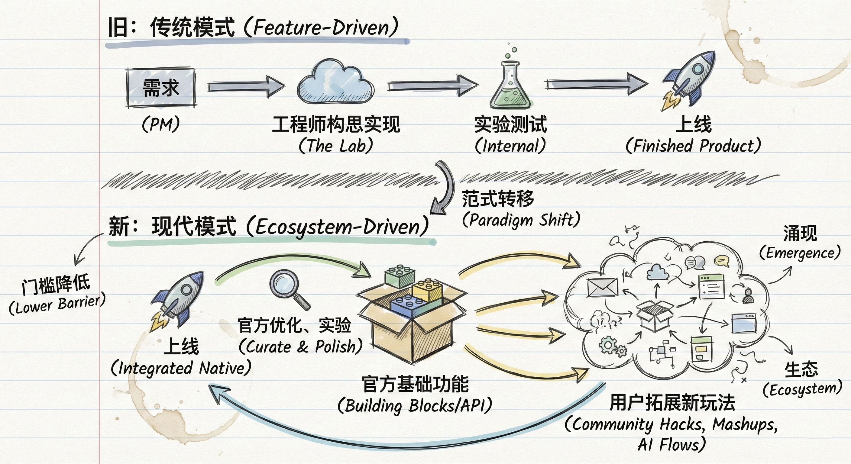 用户基于官方基础功能自由组合,拓展新玩法 → 官方跟进优化与实验 → 上线